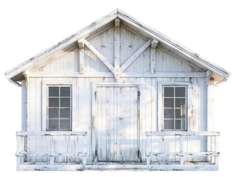 Front view of an old wooden barn painted white with two windows and a door, capturing a rustic and weathered charm.