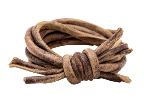 Rustic distressed leather cord tied in a knot, evoking artisanal craftsmanship and natural textures for creative projects and design inspiration.