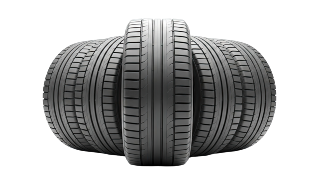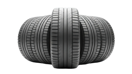 Stack of three car tires isolated PNG on transparent background, new black rubber automobile tyres for vehicle safety and transportation