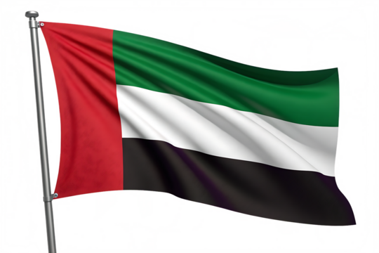 United Arab Emirates Flag: The vibrant, dynamic colors of the United Arab Emirates' flag dance gracefully in the breeze, a symbol of national pride and identity, in a photorealistic rendering.