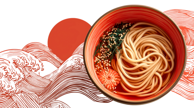 Udon noodle soup bowl sesame seaweed chrysanthemum wave red abstract Japanese udon noodle soup red bowl with sesame, seaweed, chrysanthemum, and abstract wave background, warm minimal, isolated