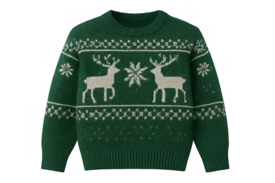 Red and white christmas sweater with reindeer design on front isolated on transparent background