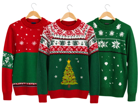 Set of Three Festive Christmas Ugly Sweaters with Colorful Patterns isolated on transparent background PNG