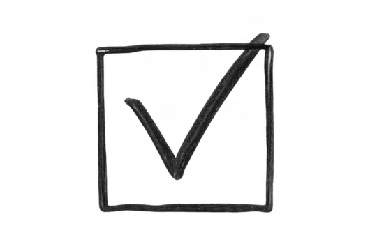 Hand drawn check mark symbol inside a box, representing approval, completion, and choosing, on transparent background
