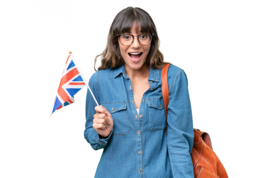 Young caucasian woman holding an United Kingdom flag over isolated background with surprise facial expression