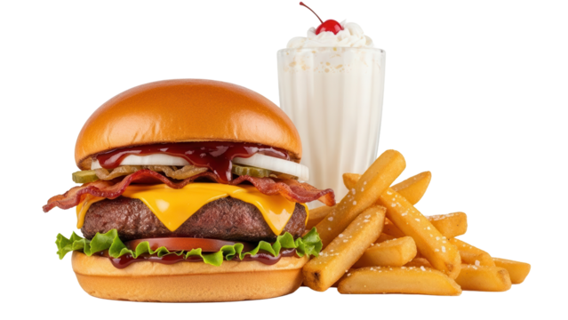 Ultimate barbeque burger set with thick cut fries and a creamy vanilla shake isolated on white background