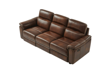 A luxurious brown leather three-seater reclining sofa, featuring plush cushions and elegant stitching, designed for ultimate comfort and modern living spaces. background removed