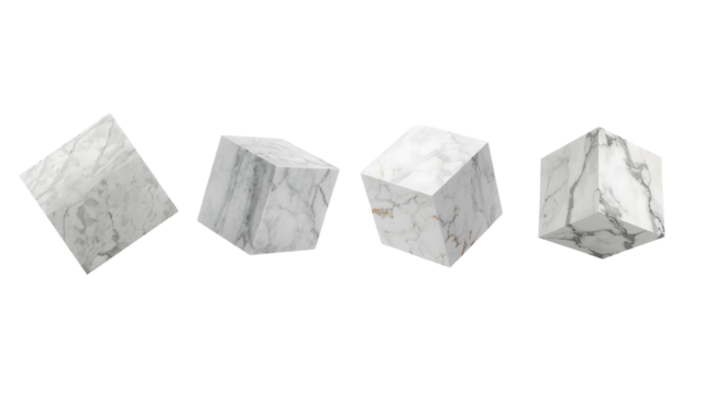 Four Floating Geometric Marble Cubes PNG Set, Ultra Realistic 4K Minimal Abstract Stone Blocks Isolated on White Background for Branding, Mockups, Modern Design, Architecture, and Commercial Stock Us