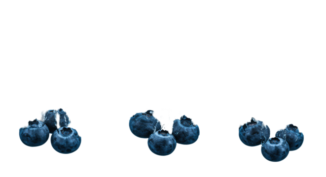 three hyper-realistic, dewy blueberries creating ultramarine liquid splash crowns, high-speed macro shot on a transparent background with intense strobe lighting. concept for beverage advertising