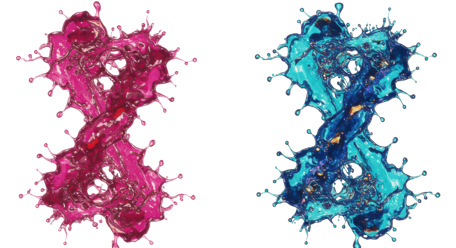 Macro shot of four hyperrealistic 3d splashes of glossy magenta, cyan, ultramarine, red, and gold-orange liquid ribbons and micro-droplets against a transparent void. Concept of complex fluid dynamics