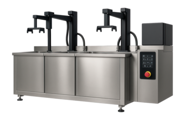 Multi-tank ultrasonic cleaning system with automated lifting mechanisms and PLC controls for large-scale industrial applications.