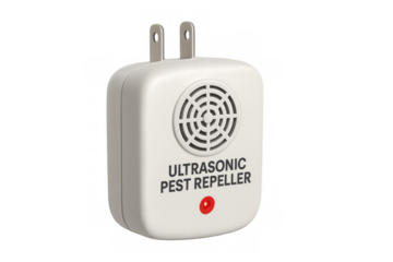Ultrasonic pest repeller device plugged into wall socket with transparent background