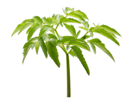 White umbel flower on tall stem with three-part, serrated leaves, elderflower plant