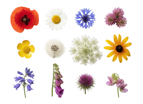 Collection of twelve different colorful wild and garden flower heads isolated on transparent background for botanical study or design