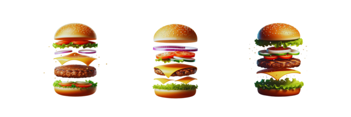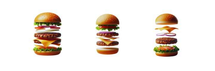 Set of A floating unassembled cheeseburger, isolated over on transparent white background