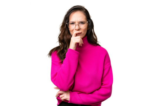 Thoughtful woman transparent background licking lips expression