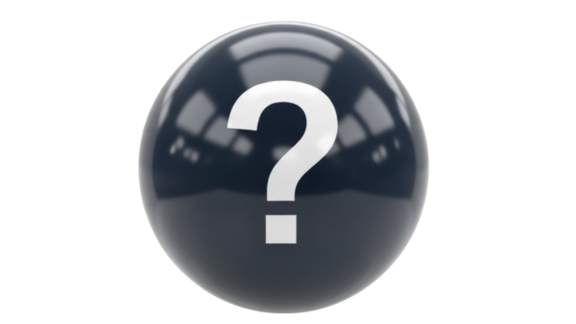 Shiny dark blue sphere with question mark isolated PNG, glossy ball with reflection on transparent background, uncertainty and mystery concept