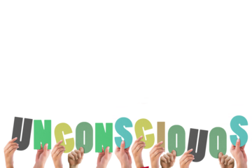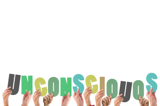 Transparent hands elevating rainbow letters spelling unconscious