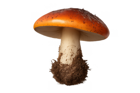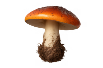 Amanita muscaria mushroom with a distinctive red cap and white stalk on a transparent background, growing in natural soil