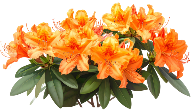 Vibrant orange rhododendron blooms with green leaves, cut-out on a transparent background