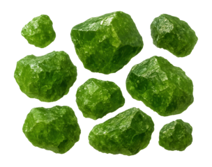 Cluster of sparkling emerald green crystals with sharp facets and geometric shapes isolated on a transparent background