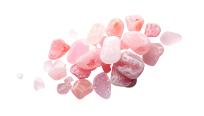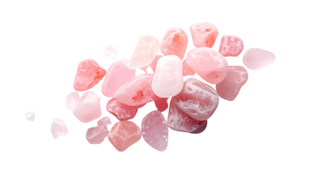 A close-up of a pile of rose quartz gemstones, translucent and varying in pink hues