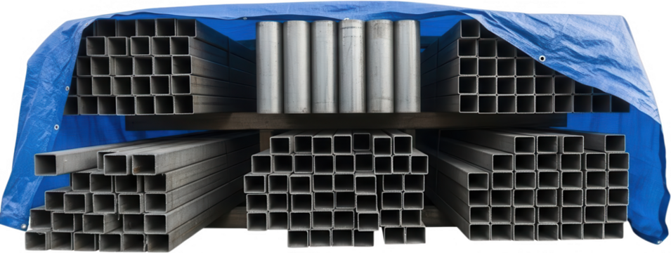 Piled metal square tubes and round pipes are stored under a protective blue tarp on wooden shelves steel construction industry material structural building industrial warehouse storage