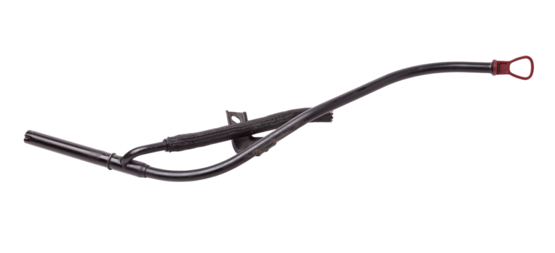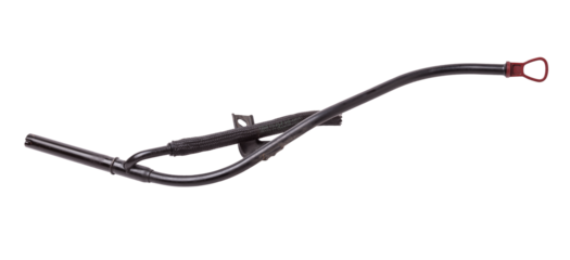 The dipstick for measuring the engine oil level in black with a red handle close-up on the white isolated background. The standard device is stored under the hood of the car.