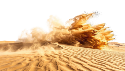Desert explosion of sand, dunes shimmering under intense sunlight