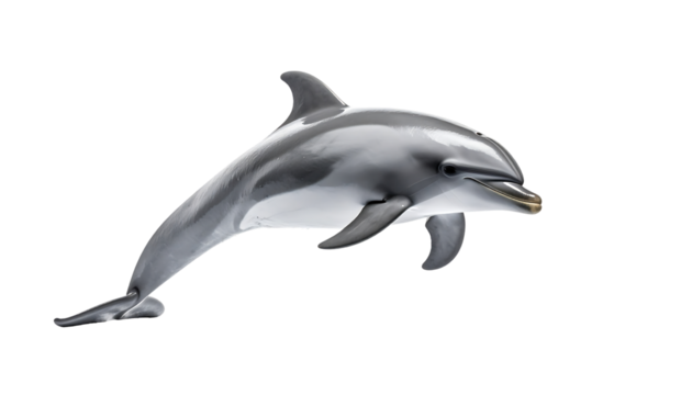 A sleek, grey dolphin leaps gracefully, its body arched, showcasing a lighter underbelly and a dark grey dorsal fin against a black background