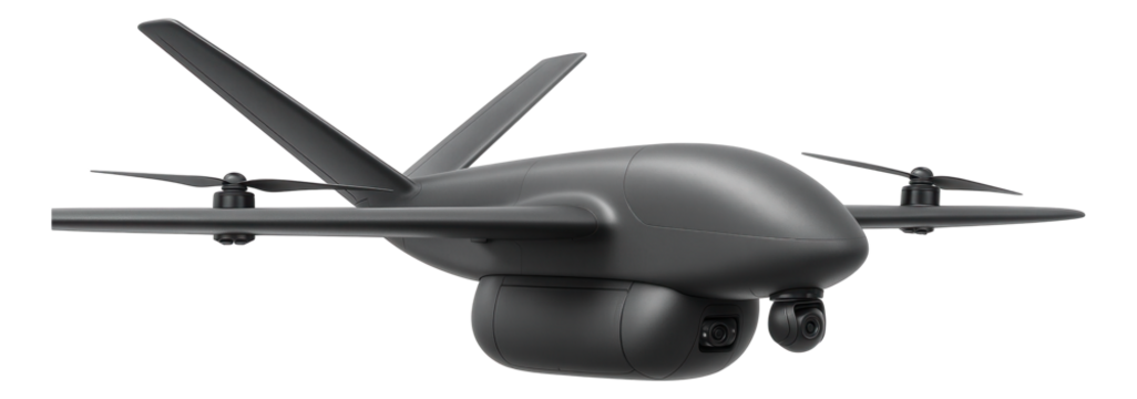 V-tail fixed-wing drone with underbelly cargo capacity.