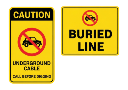 Caution sign for underground cable, warning of buried line and instructing to call before digging, with a clear prohibition symbol for vehicles