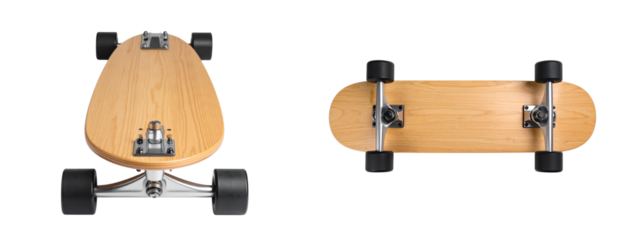 Underside View of Wooden Skateboard with Metal Trucks, isolated on white background