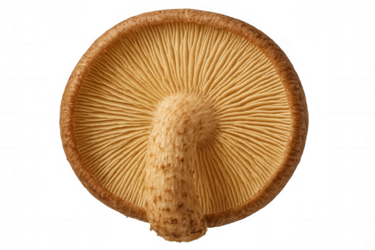 Shiitake mushroom underside with textured gills and stem, showing healthy organic edible fungus on transparent background