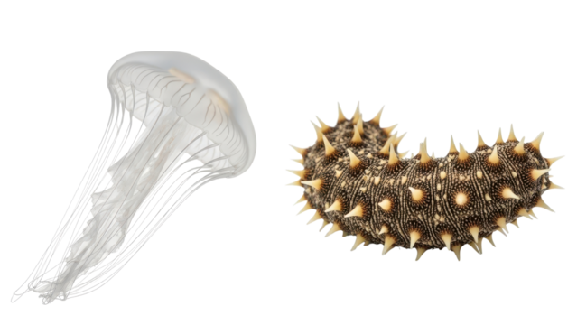 Transparent Jellyfish and Spiky Sea Cucumber Marine Life isolated PNG with Transparent Background