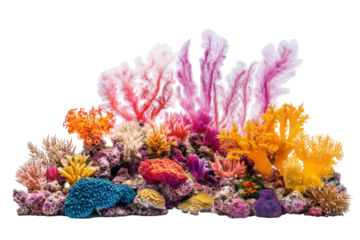 Vibrant underwater coral reef scene isolated on transparent background. Colorful coral reef with many different colors isolated on white background.