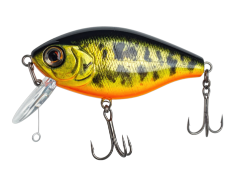 A detailed close-up shot of a hard-bodied, lifelike fishing lure with treble hooks