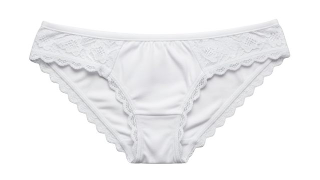 White women's underwear with intricate lace trim displayed on a clean white background