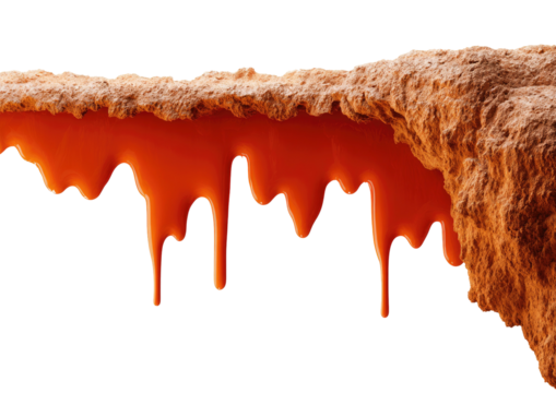 The image depicts a dark rock formation with bright orange and yellow lava glowing through cracks, suggesting volcanic activity.
