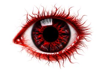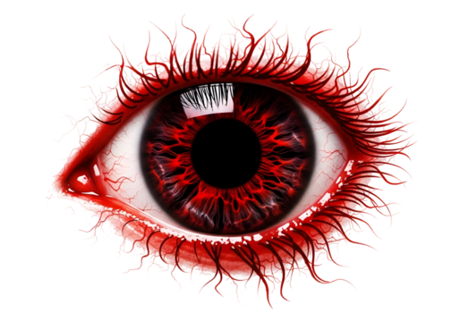A striking, artistic eye, crimson in color, with detailed, textured lashes, set against a stark black background, conveys a sense of unease and intrigue.