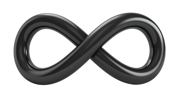 Rendered 3D gray infinity symbol against a black background, with glossy appearance