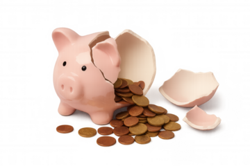 Broken piggy bank spilling out coins, showing financial crisis, debt, poor savings and economic loss