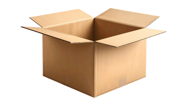 An open, empty brown cardboard box with flaps unfolded against a solid black background