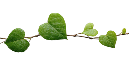 Delicate green heart-shaped leaves unfurl on a thin, brown vine against black
