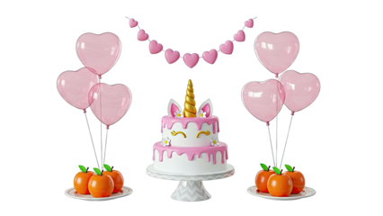 Unicorn Birthday Cake with Pink Heart Balloons and Apples