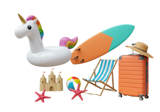 Vibrant still life collection of summer holiday items and accessories, floating weightlessly on a transparent background. Concept of summer vacation anticipation