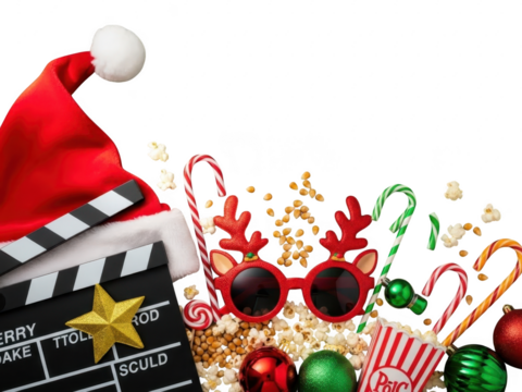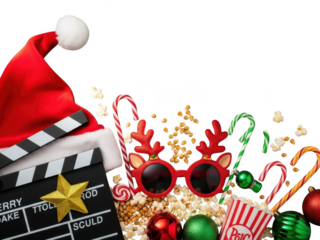 Festive holiday movie night accessories with santa hat and reindeer glasses isolated on transparent background