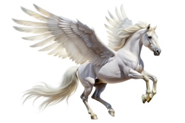 Majestic white winged horse, Pegasus, in flight,  isolated on a white background