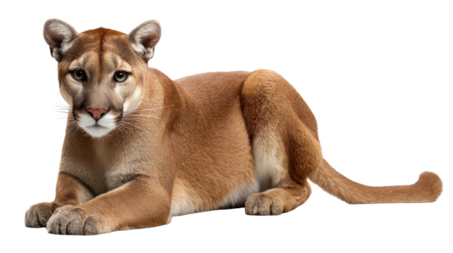 Cougar's Calm Vigil: A majestic cougar rests serenely, embodying the epitome of wild grace and strength, staring directly, its gaze captivating viewers.