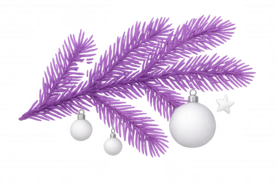Purple christmas tree branch with white ornaments and star, festive seasonal holiday decoration, transparent background